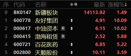 当日,新疆板块股价涨幅排名前5的股票分别为:友好集团(600778)收盘价4.91元,涨幅10.09%;中油资本(000617)收盘价6.15元,涨幅10.02%;渤海租赁(000415)收盘价2.52元,涨幅5.88%;百花医药(600721)收盘价6.85元,涨幅5.22%;天顺股份(002800)收盘价10.11,涨幅3.59%。