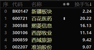 当日,新疆板块换手率排名前5的股票分别为:百花医药(600721)20.22%、熙菱信息(300588)16.13%、西部牧业(300106)11.14%、西域旅游(300859)9.42%、准油股份(002207)9.07%。