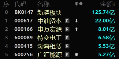 当日,新疆板块成交金额排名前5的股票分别为:中油资本(000617)22.00亿元、申万宏源(000166)8.01亿元、特变电工(600089)6.58亿元、渤海租赁(000415)5.53亿元、广汇能源(600256)5.27亿元。