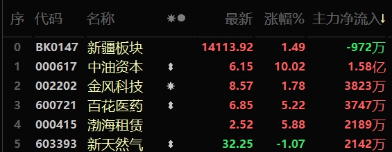 当日,新疆板块主力资金净流入排名前5的股票分别为:中油资本(000617)1.58亿元、金风科技(002202) 3823万元、百花医药(600721) 3747万元、渤海租赁(000415) 2189万元、新天然气(603393) 2142万元。