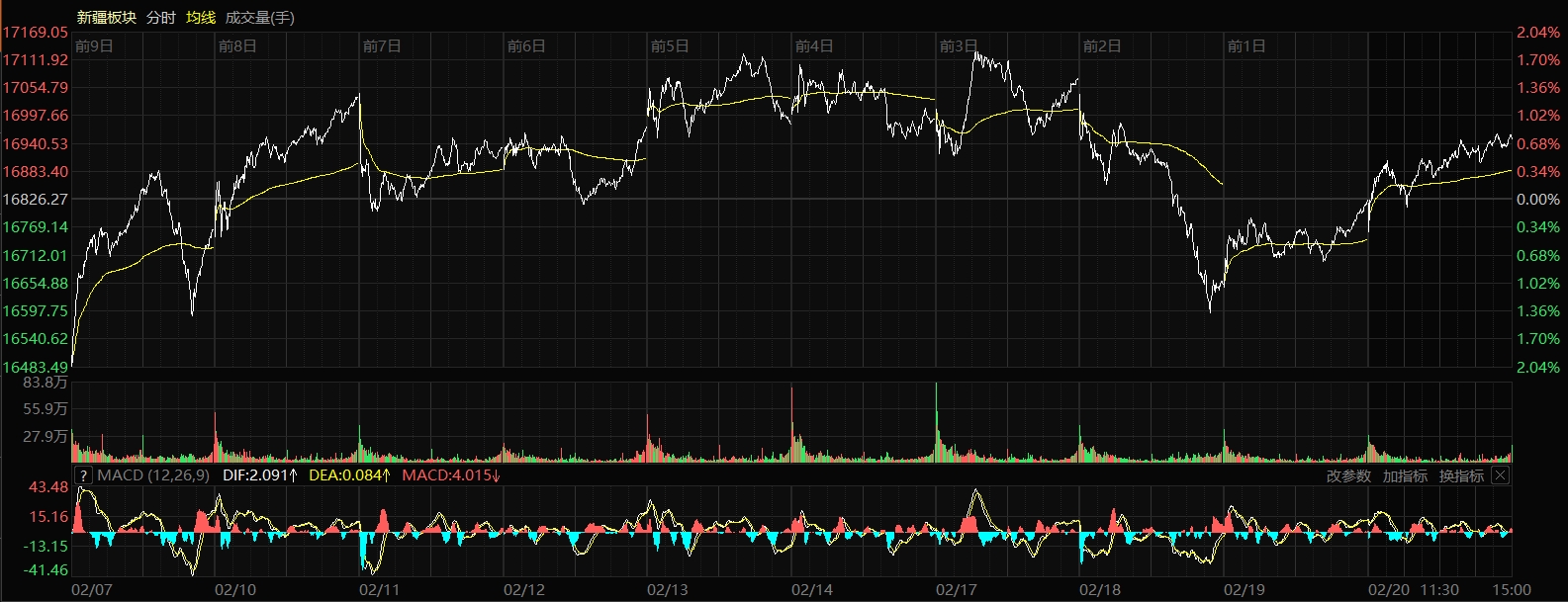 石榴云/新疆日报讯(记者 赵悦报道)2月20日收盘时,新疆板块指数16949.33,涨幅0.73%。当日,新疆板块37只股票上涨,23只股票下跌,1只股票平盘,上涨率60.66%,总换手率1.31%,总成交额88.28亿元。