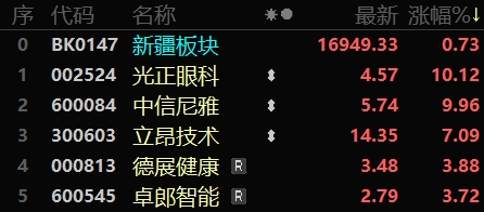 当日,新疆板块股价涨幅排名前5的股票分别为:光正眼科(002524)收盘价4.57元,涨幅10.12%;中信尼雅(600084)收盘价5.74元,涨幅9.96%;立昂技术(300603)收盘价14.35元,涨幅7.09%;德展健康(000813)收盘价3.48元,涨幅3.88%;卓郎智能(600545)收盘价2.79元,涨幅3.72%。