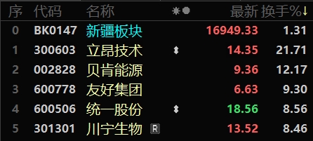 当日,新疆板块换手率排名前5的股票分别为:立昂技术(300603)21.71%、贝肯能源(002828)12.17%、友好集团(600778)9.30%、统一股份(600506)8.56%、川宁生物(301301)8.46%。