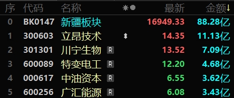 当日,新疆板块成交金额排名前5的股票分别为:立昂技术(300603)11.13亿元、川宁生物(301301)7.09亿元、特变电工(600089)4.68亿元、中油资本(000617)3.62亿元、广汇能源(600256)3.43亿元。