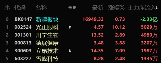 当日,新疆板块主力资金净流入排名前5的股票分别为:光正眼科(002524)5029万元、川宁生物(301301)4980万元、德展健康(000813)3207万元、立昂技术(300603)1987万元、雪峰科技(603227)1335万元。
