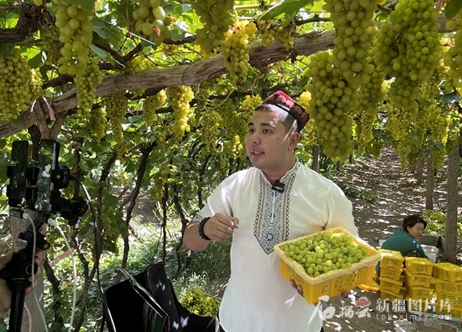 7月23日,在吐鲁番市高昌区葡萄镇的一处葡萄地,电商主播在推介刚采摘的葡萄。胡源 摄