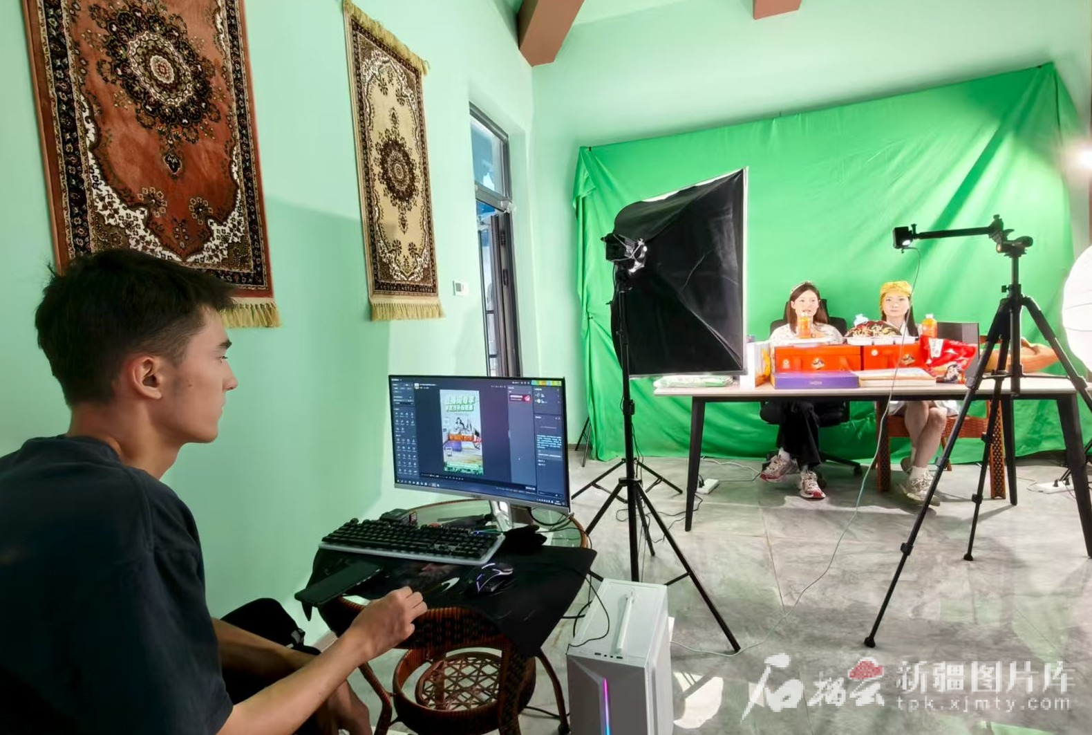 6月24日,在位于乌什县阿克托海镇库木奇吾斯塘村的幺幺直播基地,电商主播在开展直播活动。石榴云/新疆日报记者 张治立 摄