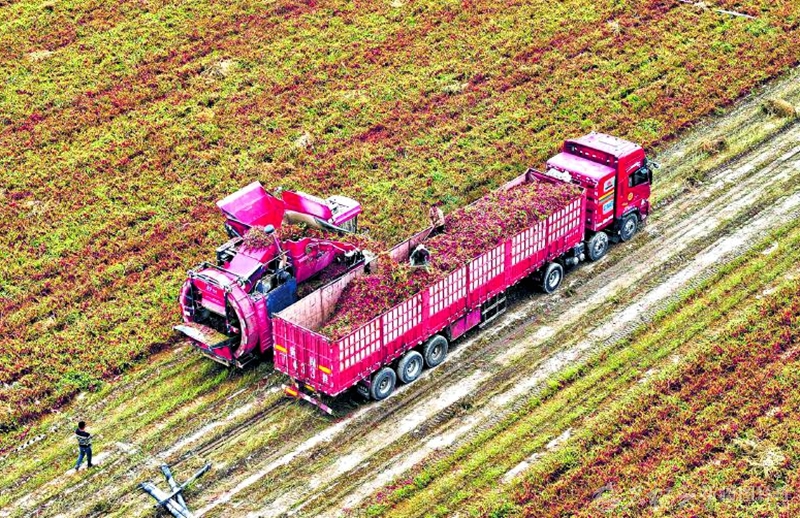 采收机在兵团第二师22团一处高标准农田里来回穿梭,进行辣椒收获作业(9月27日无人机摄)。金秋时节,农田里到处是一派繁忙的秋收景象。谢江林 摄
