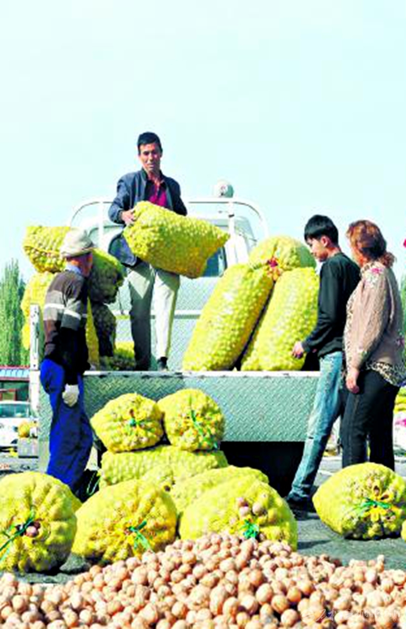 9月26日,核桃商在库车市乌恰镇甬库振兴村农副产品批发市场装运购买的核桃。近年来,该镇持续打造农特产品种植、加工、销售全产业链,助力乡村振兴。吐尔松·托胡提 摄
