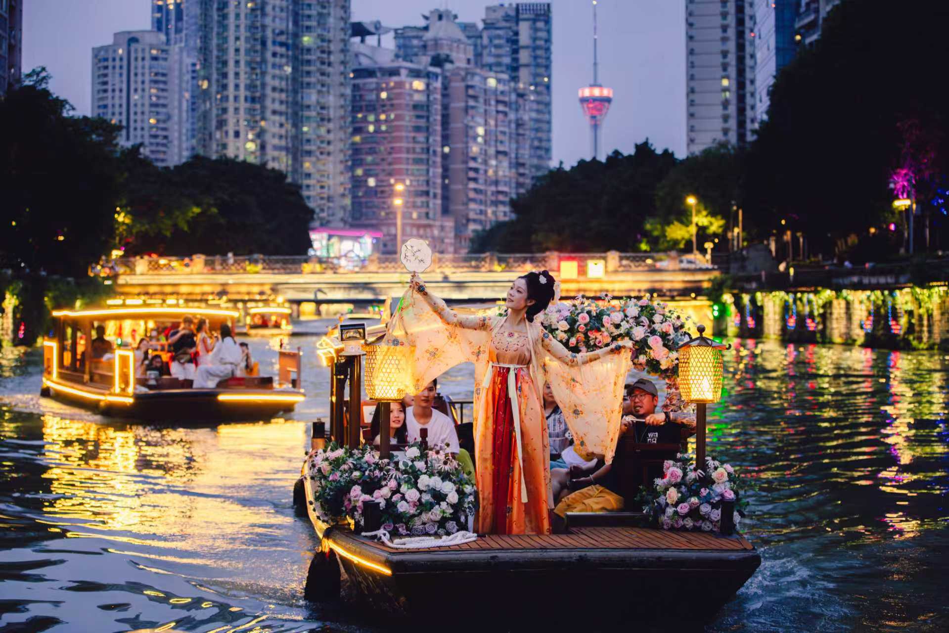 据介绍,目前,成都市有关部门正助力拓展市场和品牌推广,在锦江沿岸打造了非遗体验、网红美食、剧本杀等多元体验空间,整合夜游锦江、商圈消费、文化体验三大场景服务,朝着“蜀都味、国际范”的国际旅游目的地方向稳步前行。