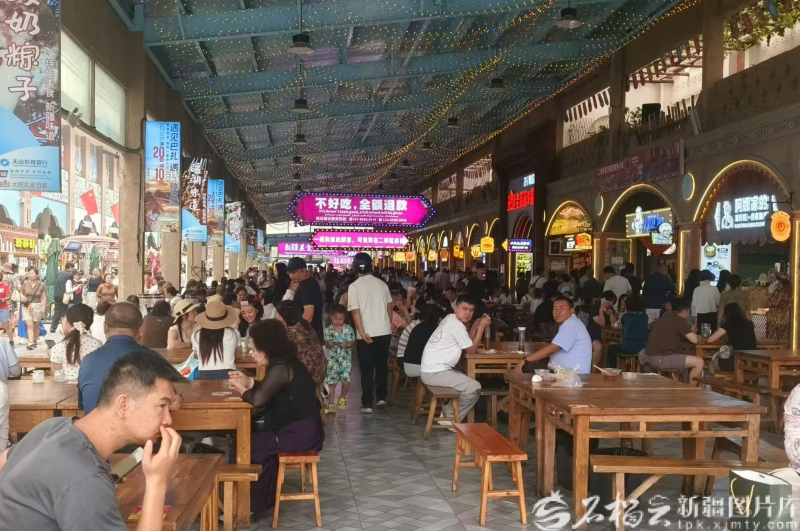 8月20日,游客在新疆国际大巴扎景区对面的美食一条街品尝美食。(资料图)