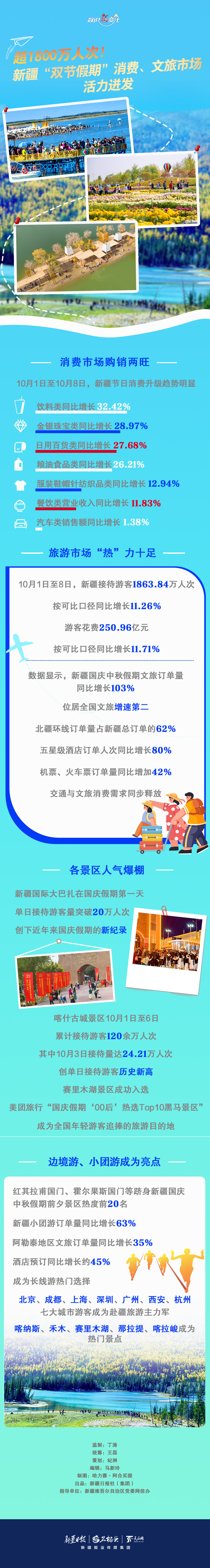 国庆中秋双节叠加,8天超长假期为新疆消费、文旅市场注入强劲动力。从城市商圈到边境口岸,从文旅景区到各类卖场,新疆各地绘就了一幅供需两旺、“新”意十足、活力迸发的假日图景。今天的《“数”说新变化》一起来了解。
