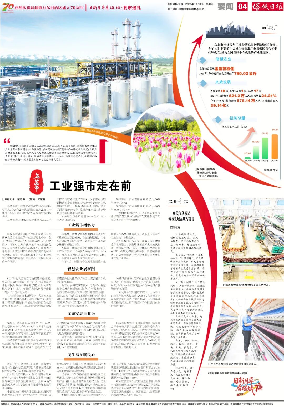 新疆广播电视台/丝路视听讯(塔城地区融媒体中心记者范春海 代姣美 宋建亮)乌苏市位于丝绸之路经济带核心区的重要节点,交通和区位优势明显。自治区成立70年来,乌苏市紧跟时代步伐,与祖国发展同频共振。从传统农业到智慧农业蓬勃兴起;从手工作坊到智能化生产车间;从仅靠道路运输到畅通的物流枢纽;从丝路驿站到建天山北坡魅力新城……70载风雨兼程,乌苏市发生了翻天覆地的变化。