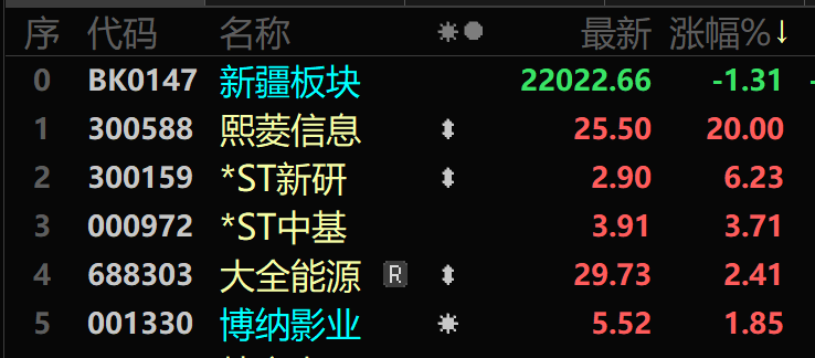 今日,熙菱信息上涨20.00%,报收25.50元;*ST新研上涨6.23%,报收2.90元;*ST中基上涨3.71%,报收3.91元;大全能源上涨2.41%,报收29.73元;博纳影业上涨1.85%,报收5.52元。新疆火炬、西部黄金、新疆交建、洪通燃气、中油资本跌幅居前。