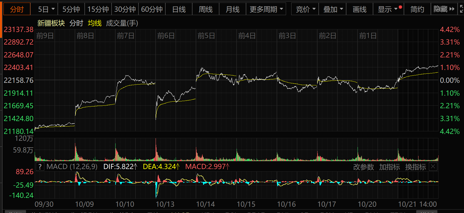 10月21日收盘时,新疆板块指数涨1.29%,报收22443.78点,46只股票上涨,14只股票下跌,1只股票平盘,个股上涨比例为75.41%,总换手率2.27%,总成交额256.52亿元。