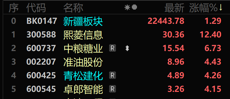 今日,熙菱信息上涨12.40%,报收30.36元;中粮糖业上涨6.73%,报收15.54元;准油股份上涨4.43%,报收8.96元;青松建化上涨4.26%,报收4.89元;卓郎智能4.15%,报收3.26元。洪通燃气、万憬能源、汇嘉时代、西域旅游、*ST新研跌幅居前。