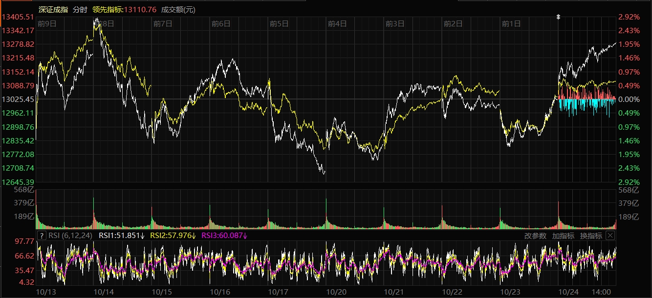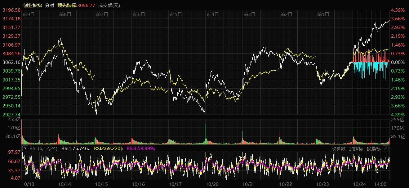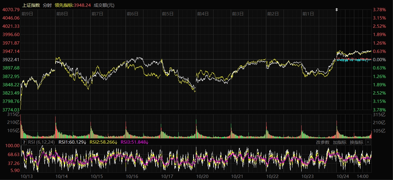 石榴云/新疆日报讯(记者 赵悦报道)10月24日,A股三大指数集体走强,沪指创十年新高。截至收盘,沪指涨0.71%,收报3950.31点;深证成指涨2.02%,收报13289.18点;创业板指涨3.57%,收报3171.57点。沪深两市成交额达19742亿元,较前一交易日大幅放量3303亿元。