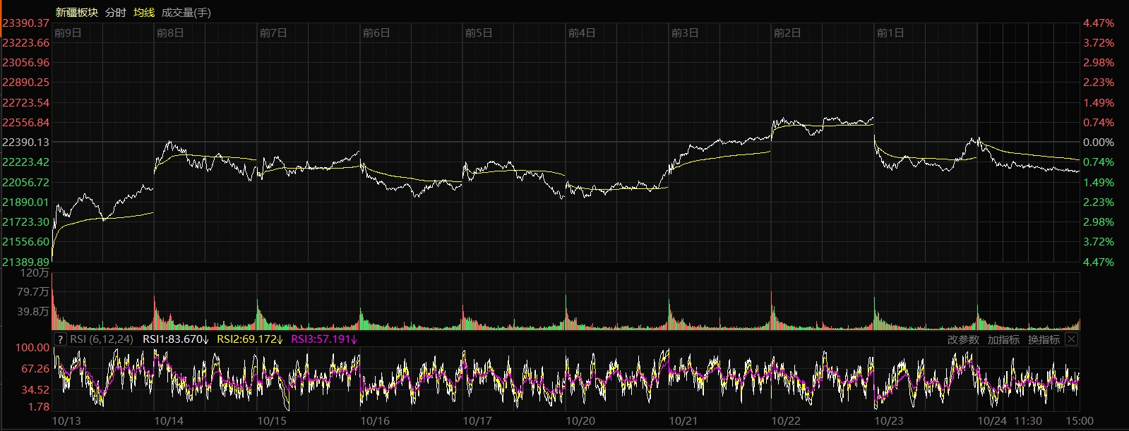 10月24日收盘时,新疆板块指数跌1.08%,报收22149.43点,16只股票上涨,45只股票下跌,个股上涨比例为26.23%,总换手率1.83%,总成交额193.90亿元。