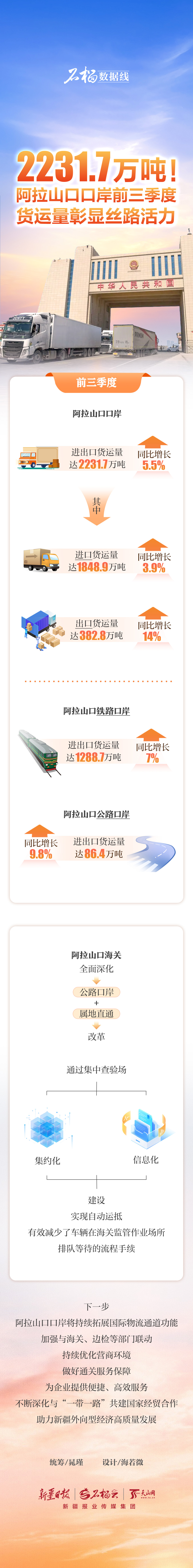 前三季度,阿拉山口口岸进出口货运量达2231.7万吨,同比增长5.5%。其中,进口货运量1848.9万吨,同比增长3.9%;出口货运量382.8万吨,同比增长14%。