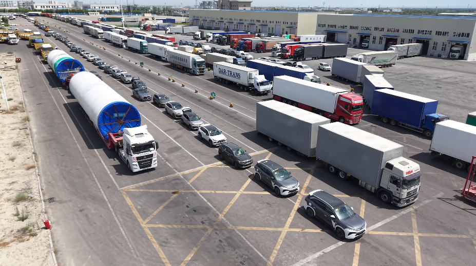 10月20日,在霍尔果斯公路口岸等待出境的商品车和运输车辆。(无人机航拍)(受访者供图)