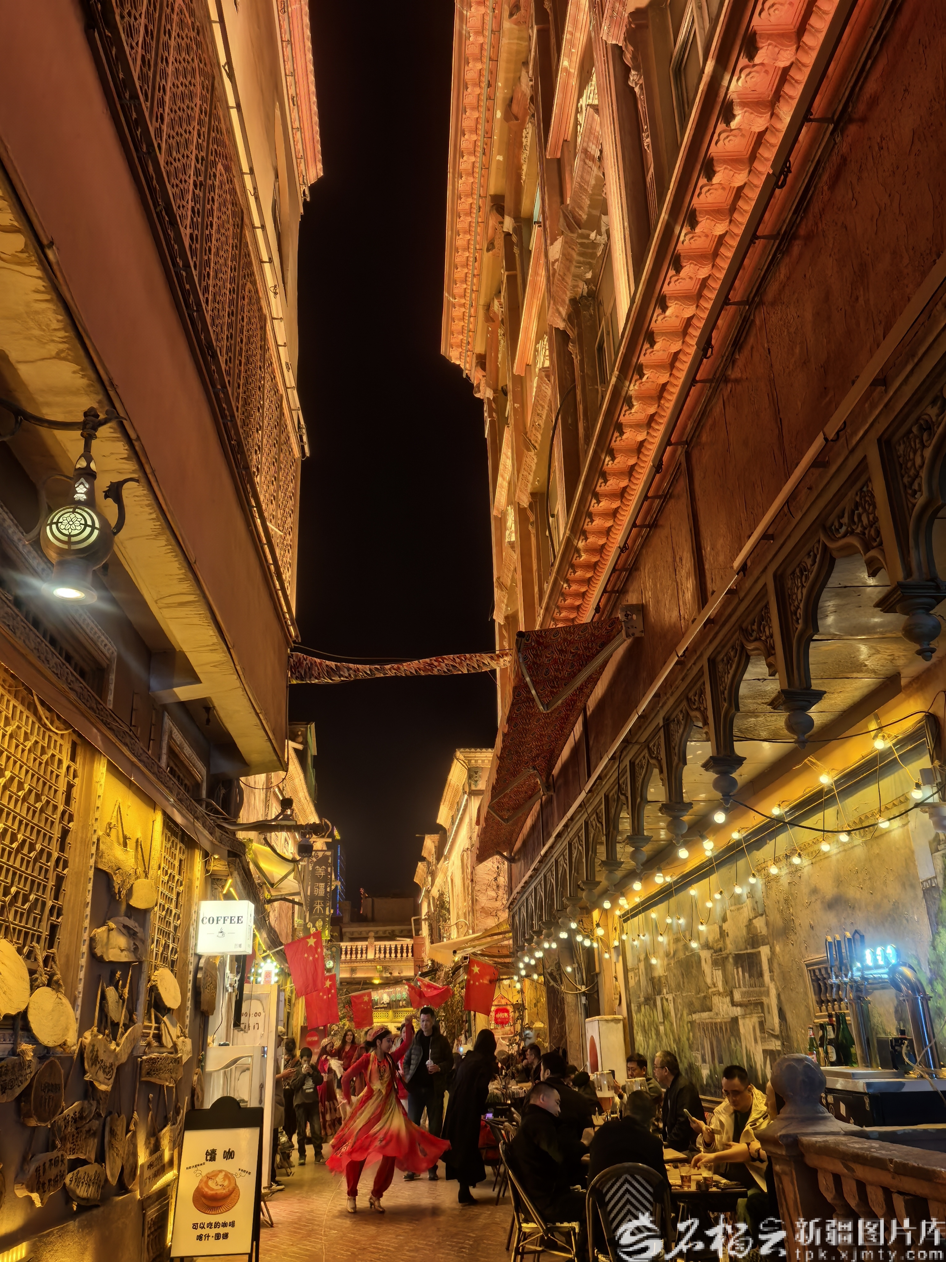 每到夜幕降临,新疆国际大巴扎步行街人潮涌动,阿凡提下午茶咖啡店里,馕杯咖啡的酥香与音乐声相融,观光塔下的游客正跟着非遗歌舞巡演起舞。