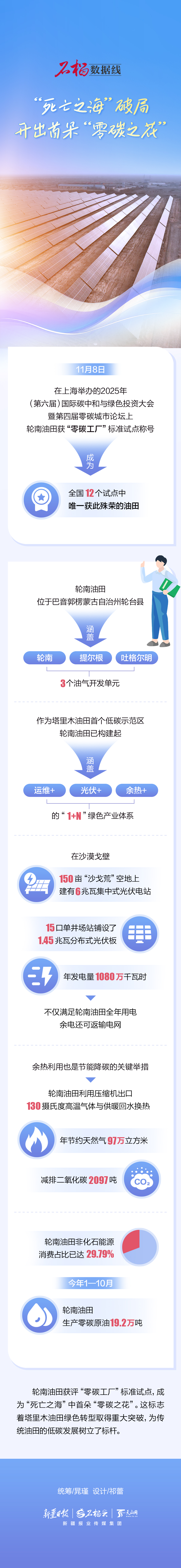 11月8日,在上海举办的2025年(第六届)国际碳中和与绿色投资大会暨第四届零碳城市论坛上,轮南油田获“零碳工厂”标准试点称号,成为全国12个试点中唯一获此殊荣的油田。这标志着塔里木油田绿色转型取得重大突破,为传统油田的低碳发展树立了标杆。