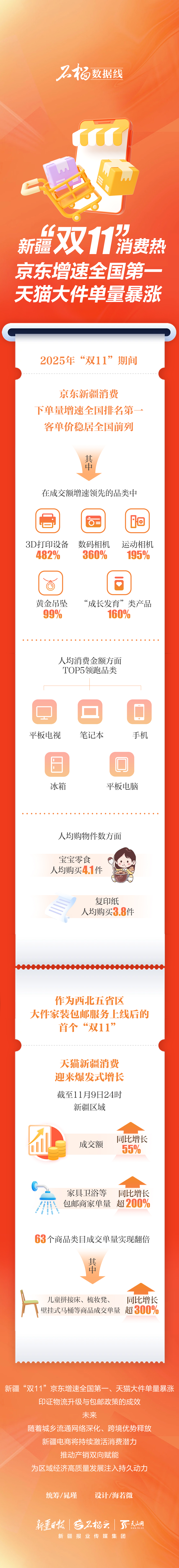 2025年“双11”期间,新疆京东消费活力迸发。数据显示,新疆不仅下单量增速全国排名第一,客单价也稳居全国前列,双重亮眼表现印证了新疆的消费潜力。作为西北五省区大件家装包邮服务上线后的首个“双11”,截至11月9日24时,新疆天猫消费迎来爆发式增长,消费活力持续释放。