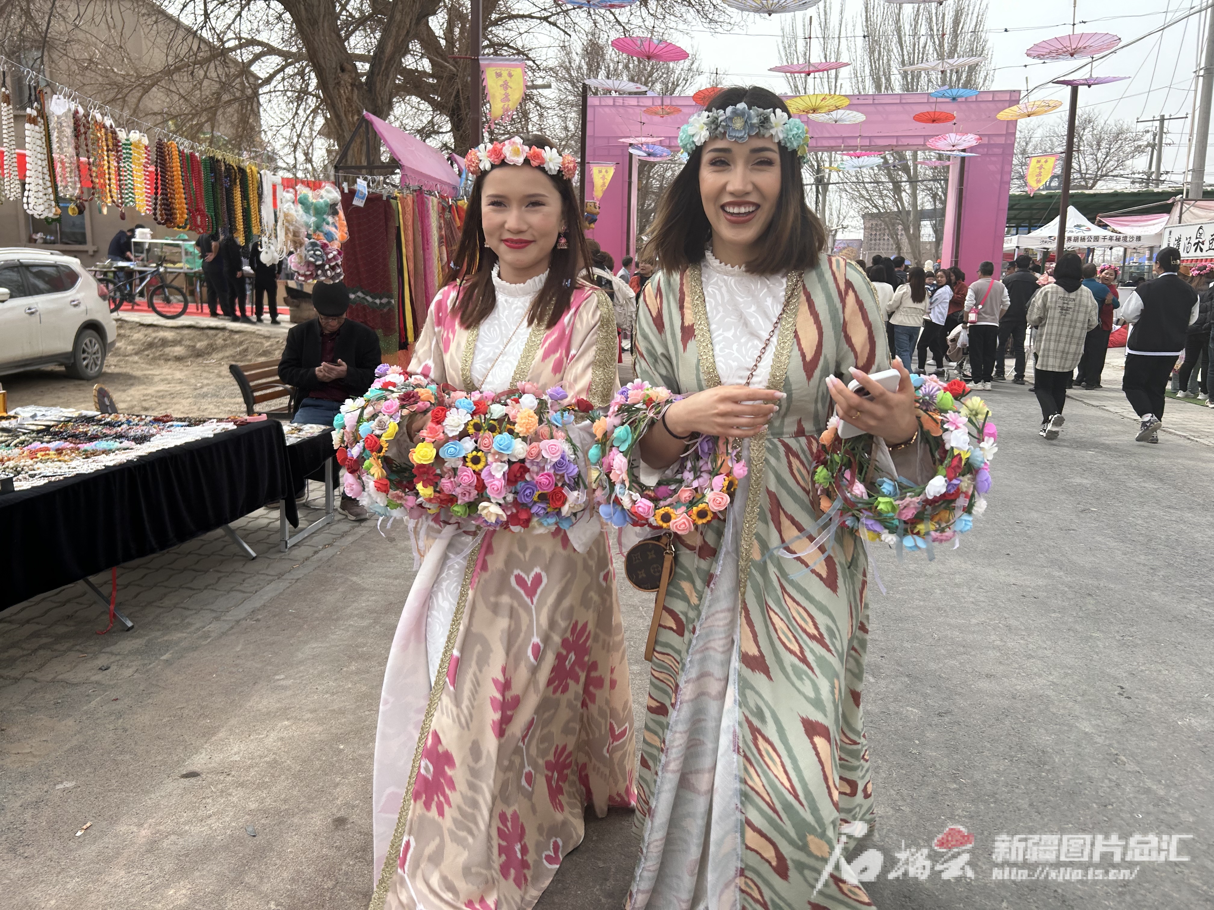 托克逊杏花节上,正在卖花环的姑娘。石榴云/新疆日报记者 阿比拜 摄