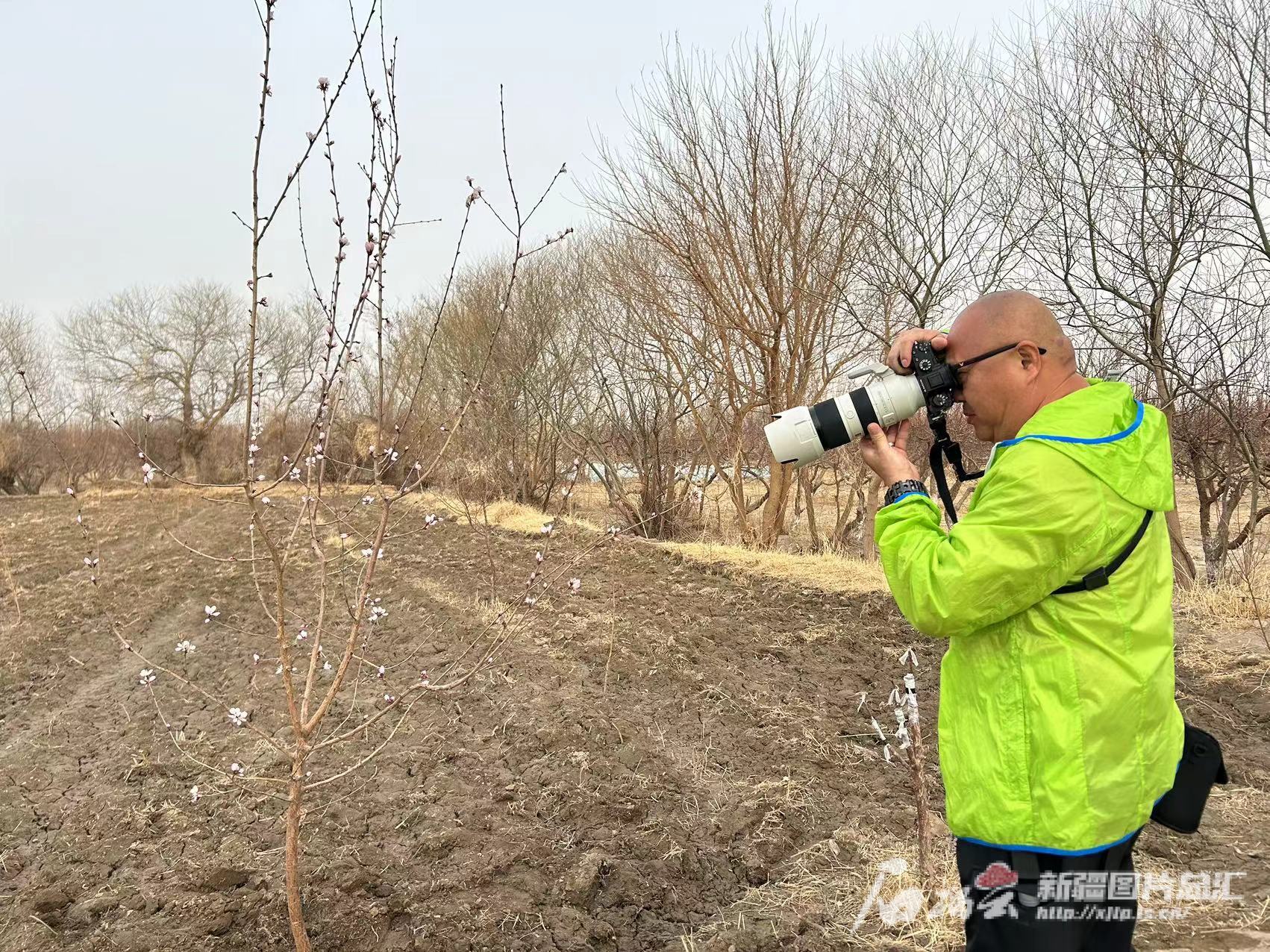 广东游客杭富荣正在拍摄杏花。石榴云/新疆日报记者 阿比拜 摄