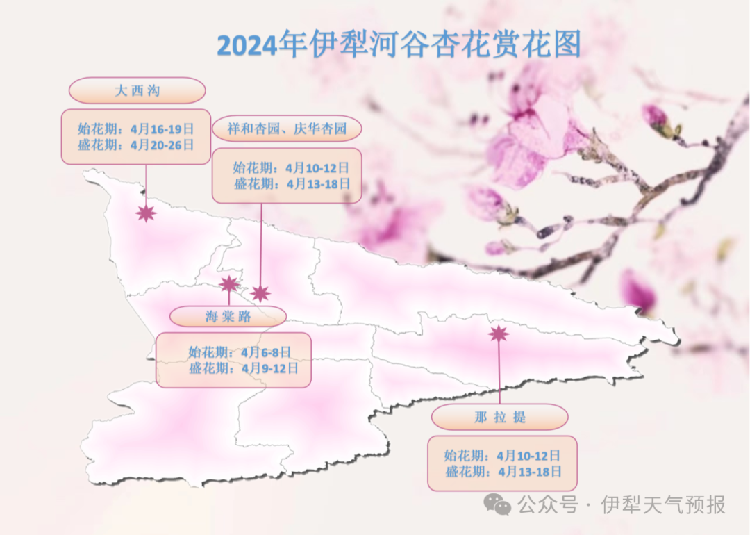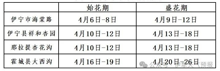 石榴云/新疆日报讯 3月20日,伊犁州气象台发布2024年伊犁河谷杏花花期预报,伊宁市海棠路杏花始花期4月6日-8日、盛花期9日-12日;伊宁县祥和杏园杏花始花期4月10日-12日、盛花期13日-18日;那拉提杏花沟杏花始花期4月10日-12日、盛花期13日-18日;霍城县大西沟杏花始花期4月16日-19日、盛花期20日-26日。