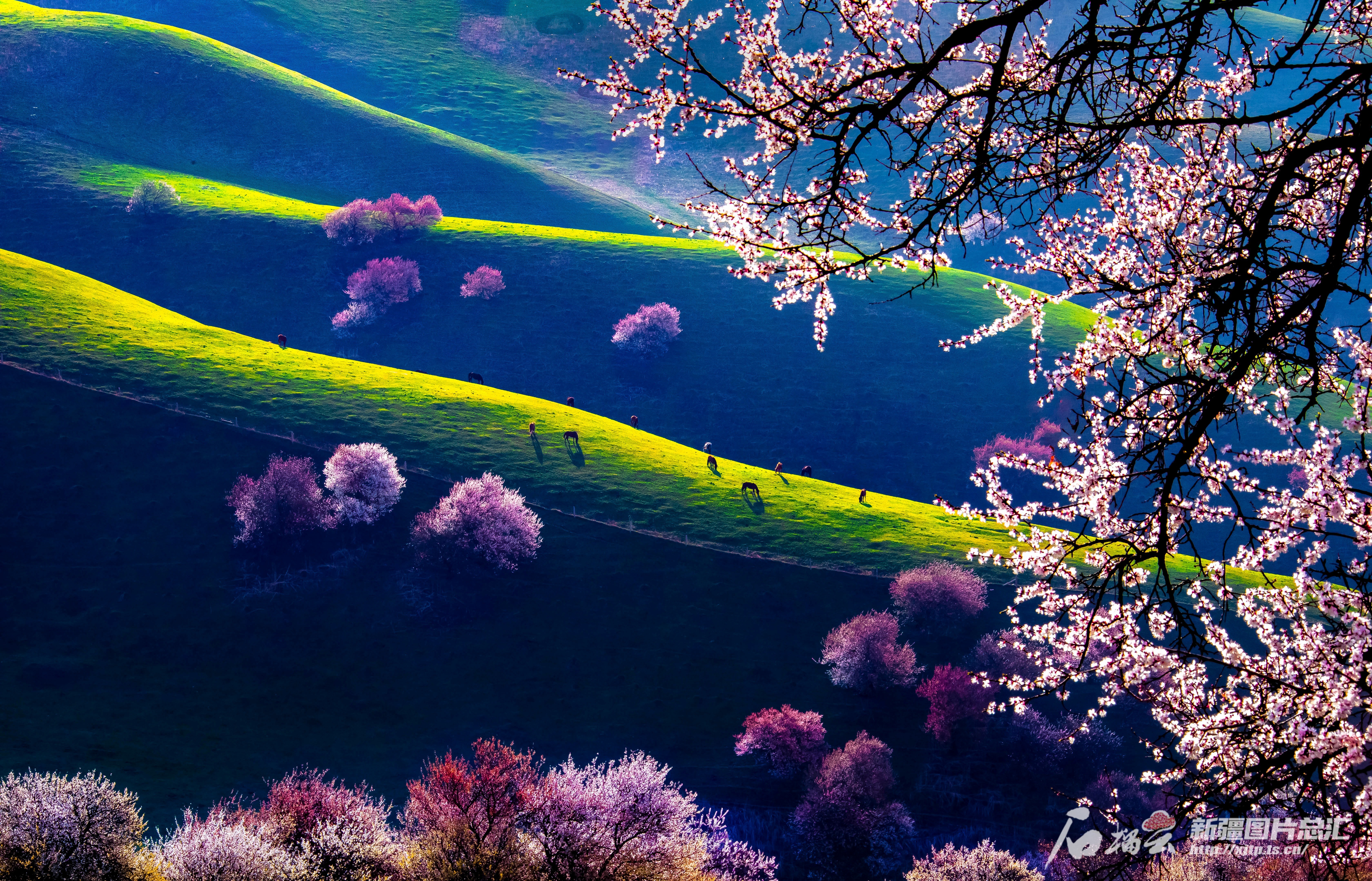 新源县吐尔根乡的那拉提杏花谷,是新疆野杏林最集中的地区之一,一朵朵杏花用深深浅浅的粉色,打造出灿若云霞的明丽花海,和青绿色的山谷共同构成让人惊艳的唯美画面。