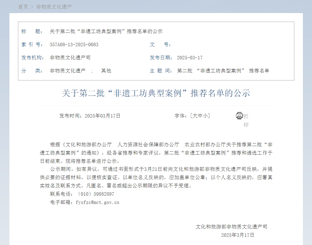 3月17日,文化和旅游部非物质文化遗产司发布《关于第二批“非遗工坊典型案例”推荐名单的公示》,经各省推荐和专家评议,51个案例入选第二批“非遗工坊典型案例”,其中,我区3个非遗工坊典型案例入选。