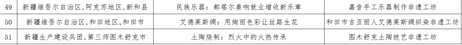 这三个典型案例分别是,阿克苏地区新和县的嘉音手工乐器制作非遗工坊,和田地区和田市的和田市吉亚丽人艾德莱斯绸织染非遗工坊,兵团第三师图木舒克市的图木舒克土陶技艺非遗工坊。
