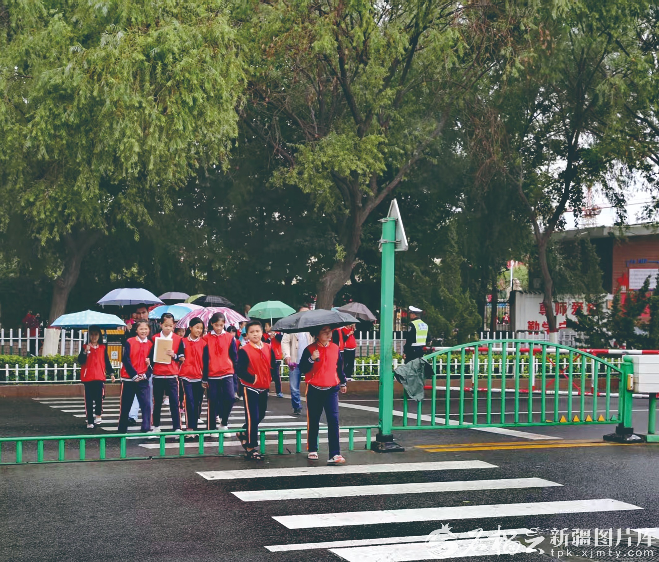 雨后的和田市街区,学生们放学后被交警护送过马路。和田地区融媒体中心供图