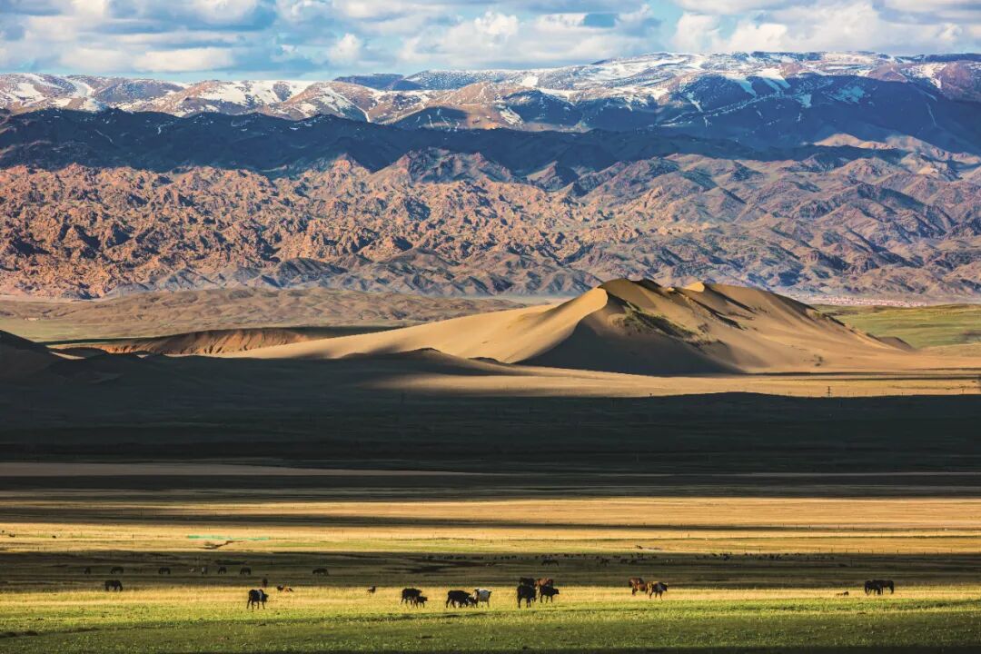 巍峨的群山挽留了海洋水汽,变成白雪,变成冰川,变成草原,变成牛羊。而在群山围合的另一边,水汽难以进入,使得那里越来越干旱,最终创造出飞沙走石的舞蹈,风削风刻,尘起尘落。