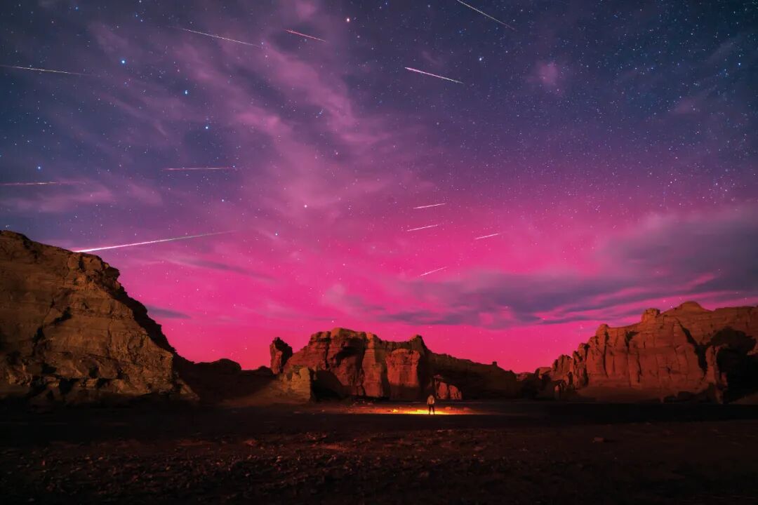 流星雨与极光,苍穹双绝,刹那永恒。图片拍摄于新疆哈密地区。摄影/薛飞