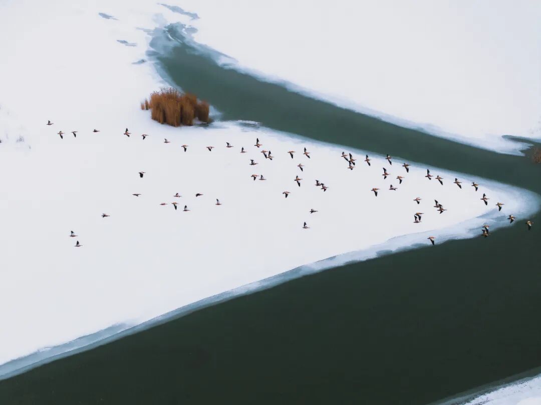 博斯腾湖水域被冻结,群鸟掠过湖面,飞往春天。摄影/文兴华