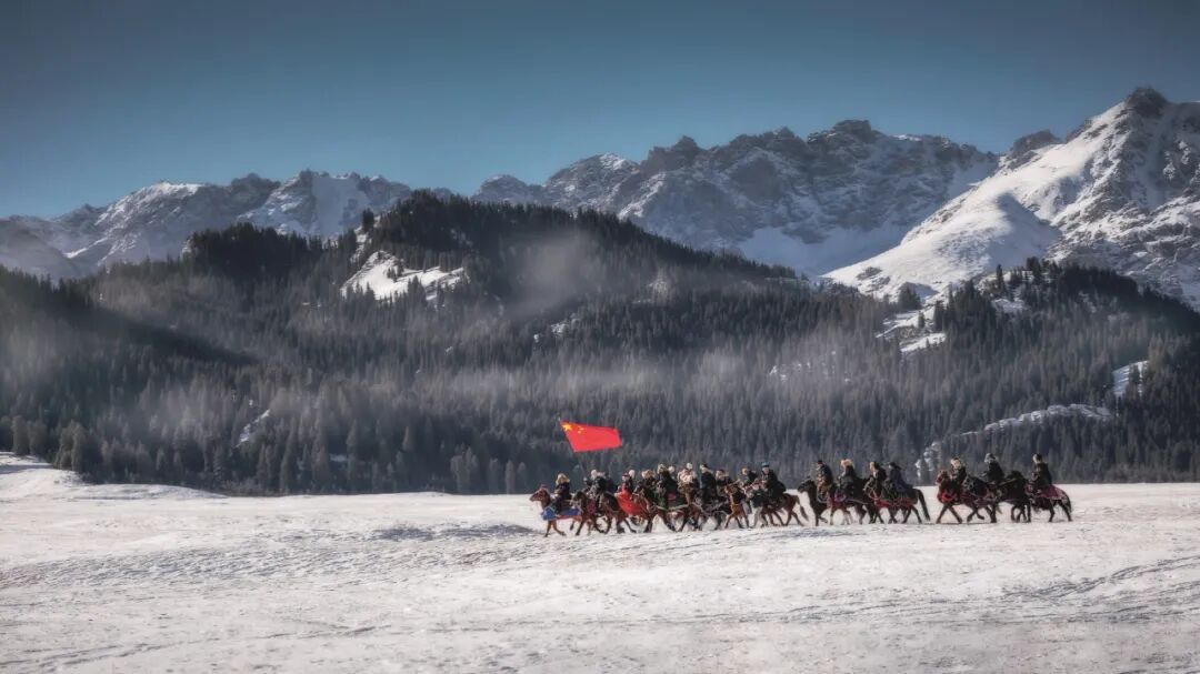 一队塔城牧民为中国越野滑雪队奥运健儿出征冬奥会送行。摄影/张波