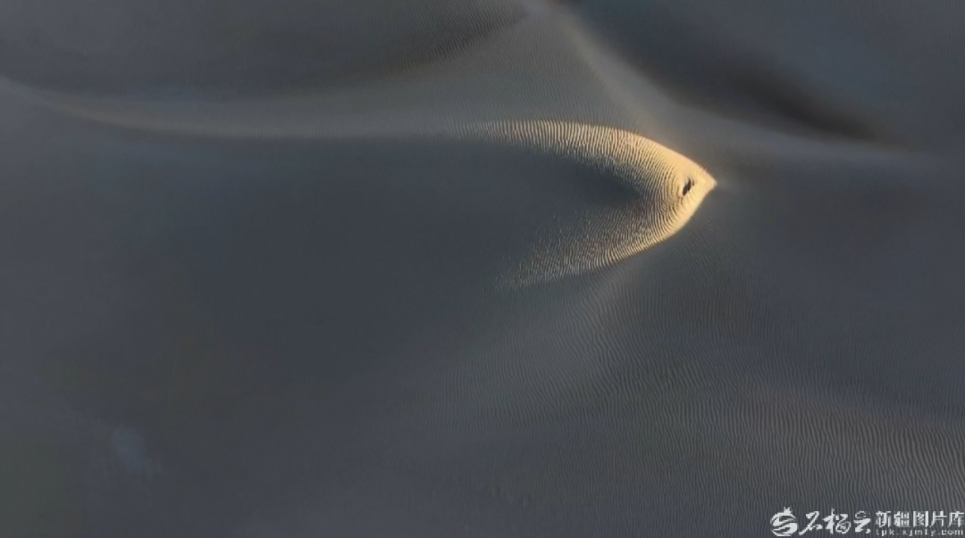 画面中,浩瀚的沙漠腹地,一个酷似鱼儿的沙丘游弋,在风的作用和光线的照射下,这片沙海静谧中透着灵气,沙漠在风的作用下形成的纹理,赋予了这条“游鱼”令人着迷的生命力,十分震撼。