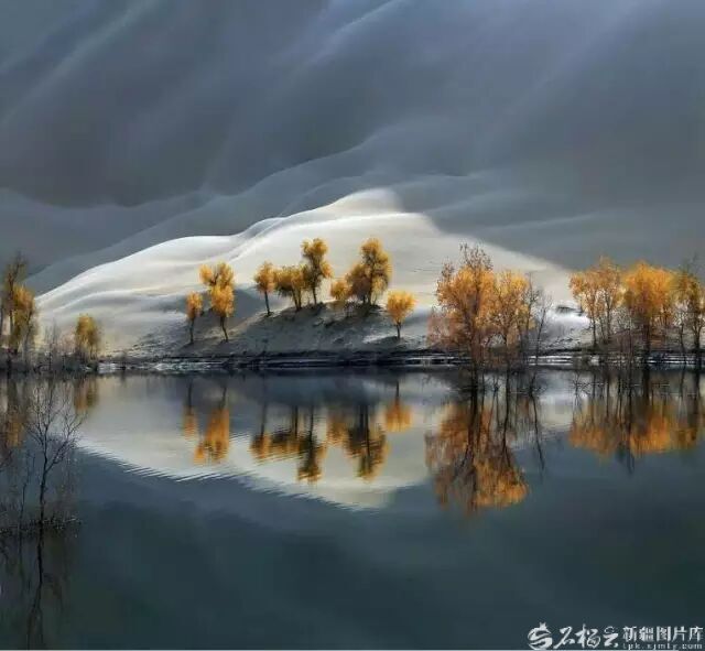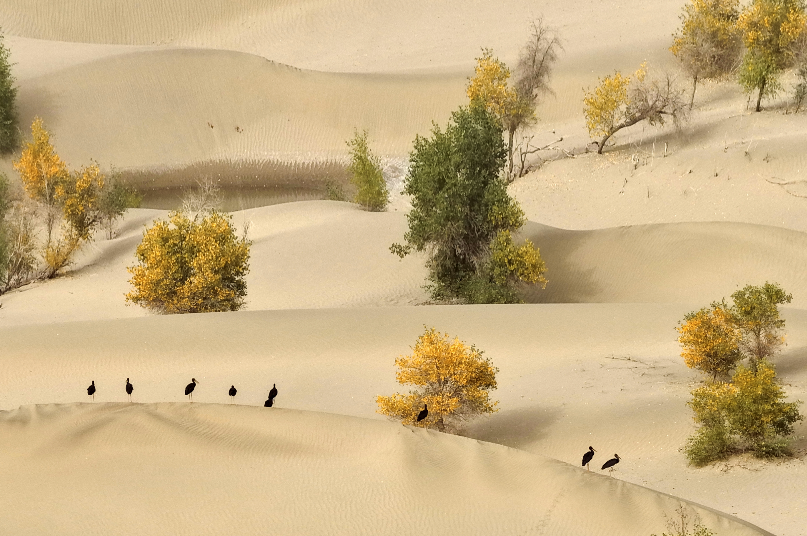 王汉冰近日拍摄的塔克拉玛干沙漠胡杨和黑鹳