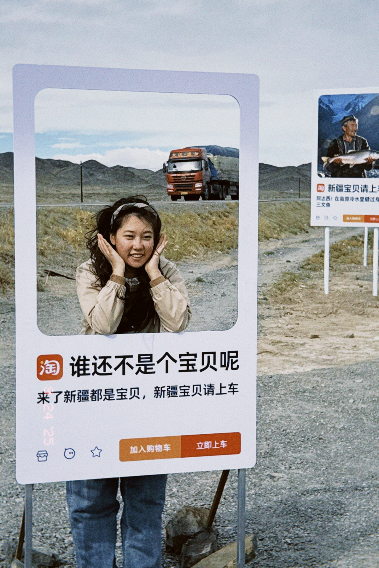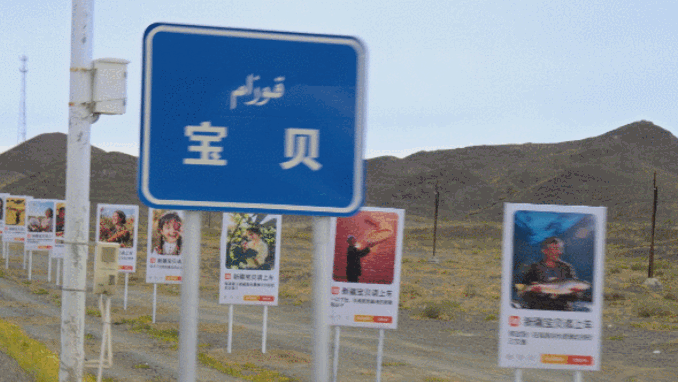 而最近,就在这条名叫“宝贝”的路上,一夜之间,“长”出了20个“宝贝”。深秋时节,假如你沿着克拉玛依至塔城的S201线自驾,当路过铁厂沟镇附近,不仅会邂逅那块叫“宝贝”的路牌,还会发现这条路已然变成了一个露天展台,每隔十米,就有一件精选的“商品框”静候于此,向那些忍不住逗留打卡“宝贝路牌”的游客们,推荐了一个又一个的新疆宝贝。