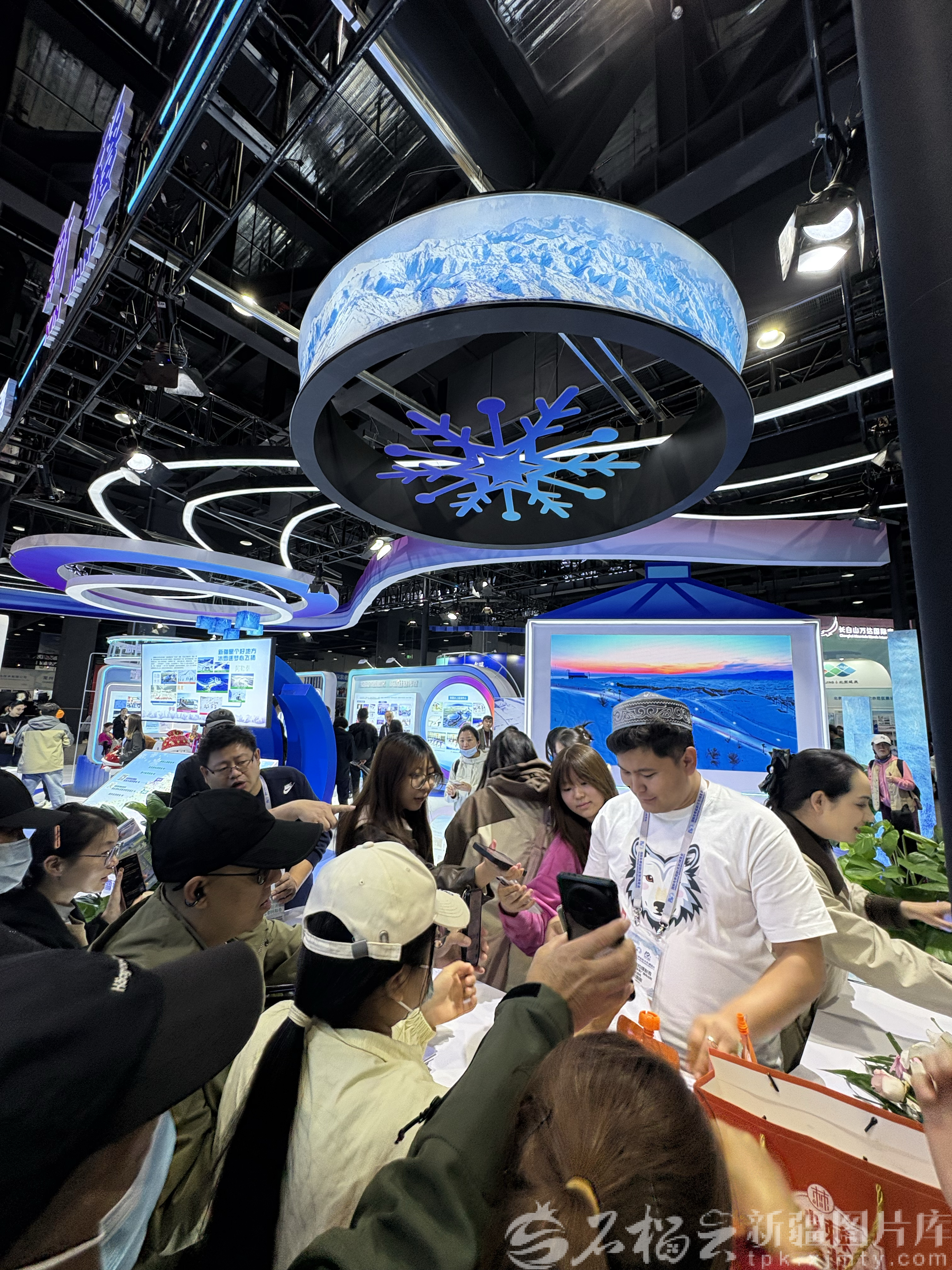 10月16日,首次组团参展的新疆展区人气旺,现场观众领取免费雪票和纪念品。石榴云/新疆日报记者 王晶晶摄