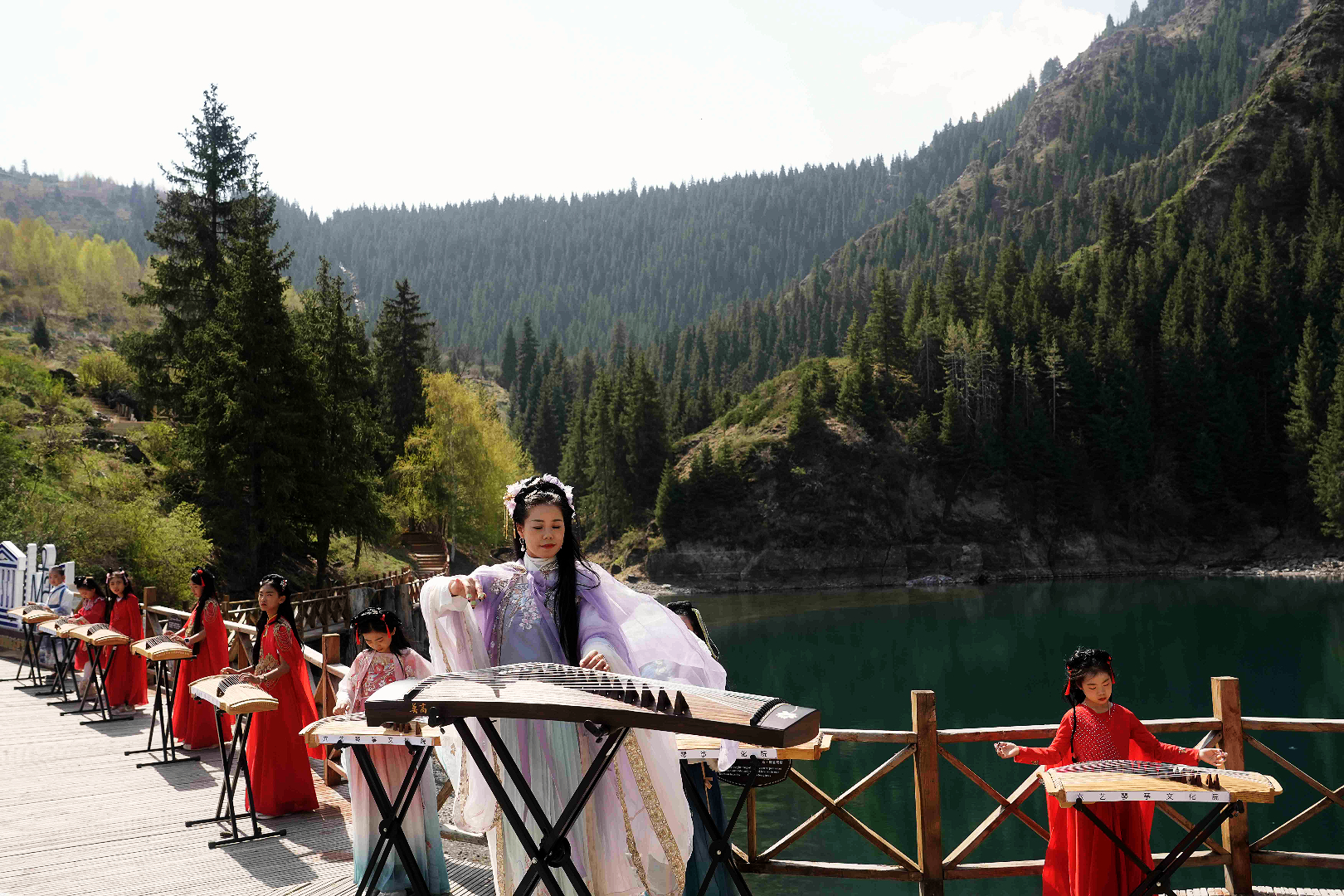 5月4日,古筝演员在天山天池景区为游客进行古筝演奏。移志向 摄