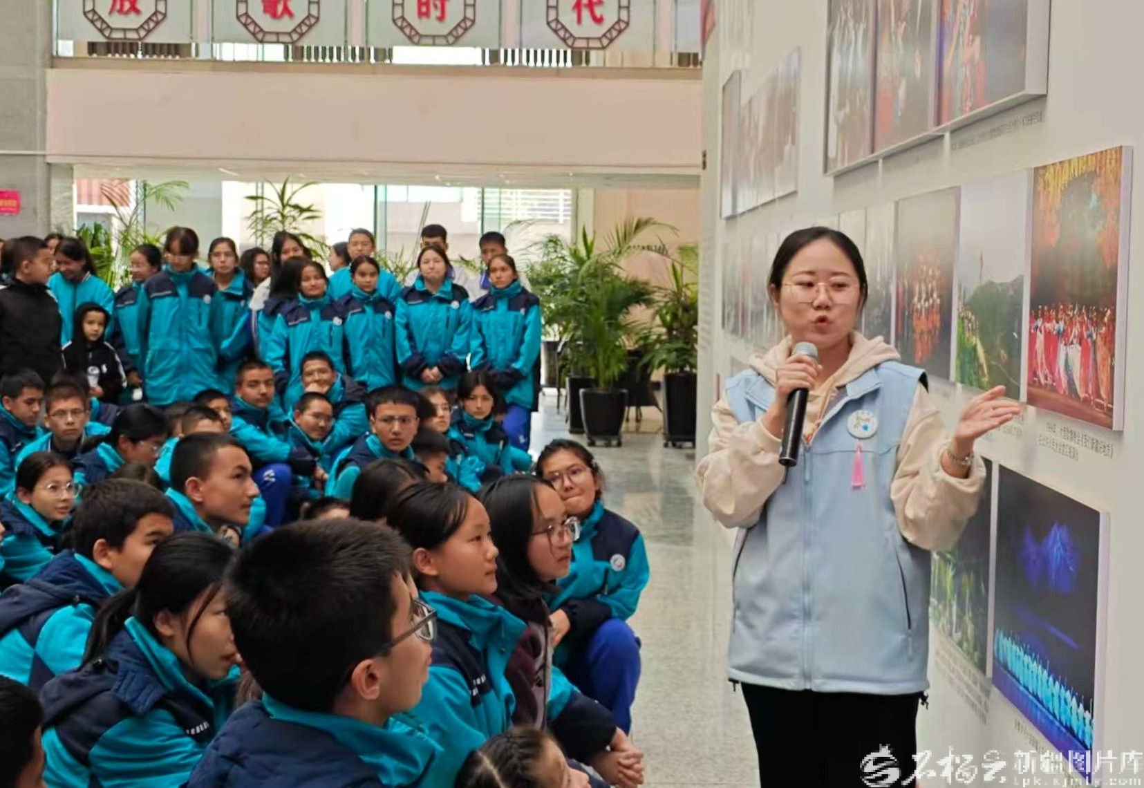 新疆艺术剧院工作人员向学生讲解新疆歌舞艺术。石榴云/新疆日报记者 宋海波摄
