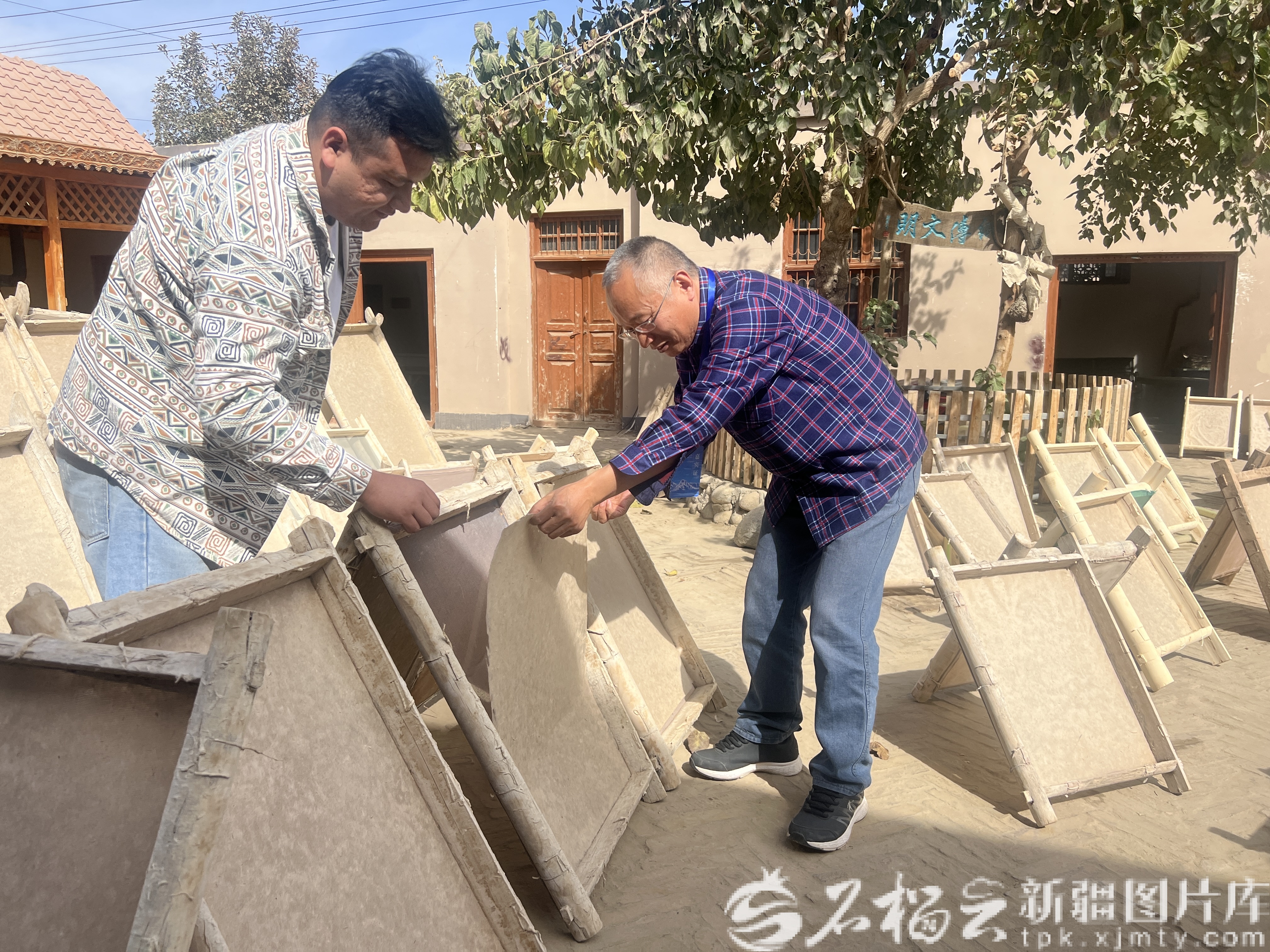 比拉力·图尔荪巴柯(左)与参观者一起揭下晾晒好的桑皮纸。石榴云/新疆日报记者 拍热扎提·阿不都摄