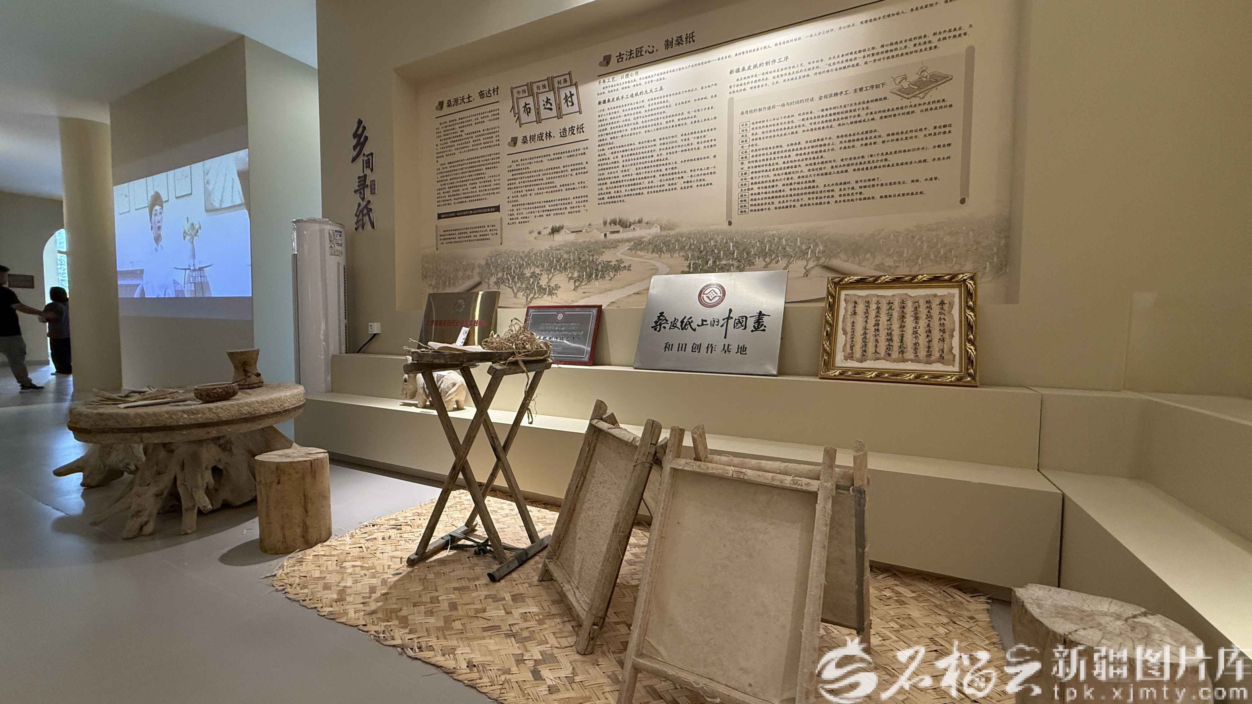 墨玉县普恰克其镇布达村桑皮纸展示馆内乡间寻纸板块陈列的桑皮纸制作流程。石榴云/新疆日报记者 拍热扎提·阿不都摄