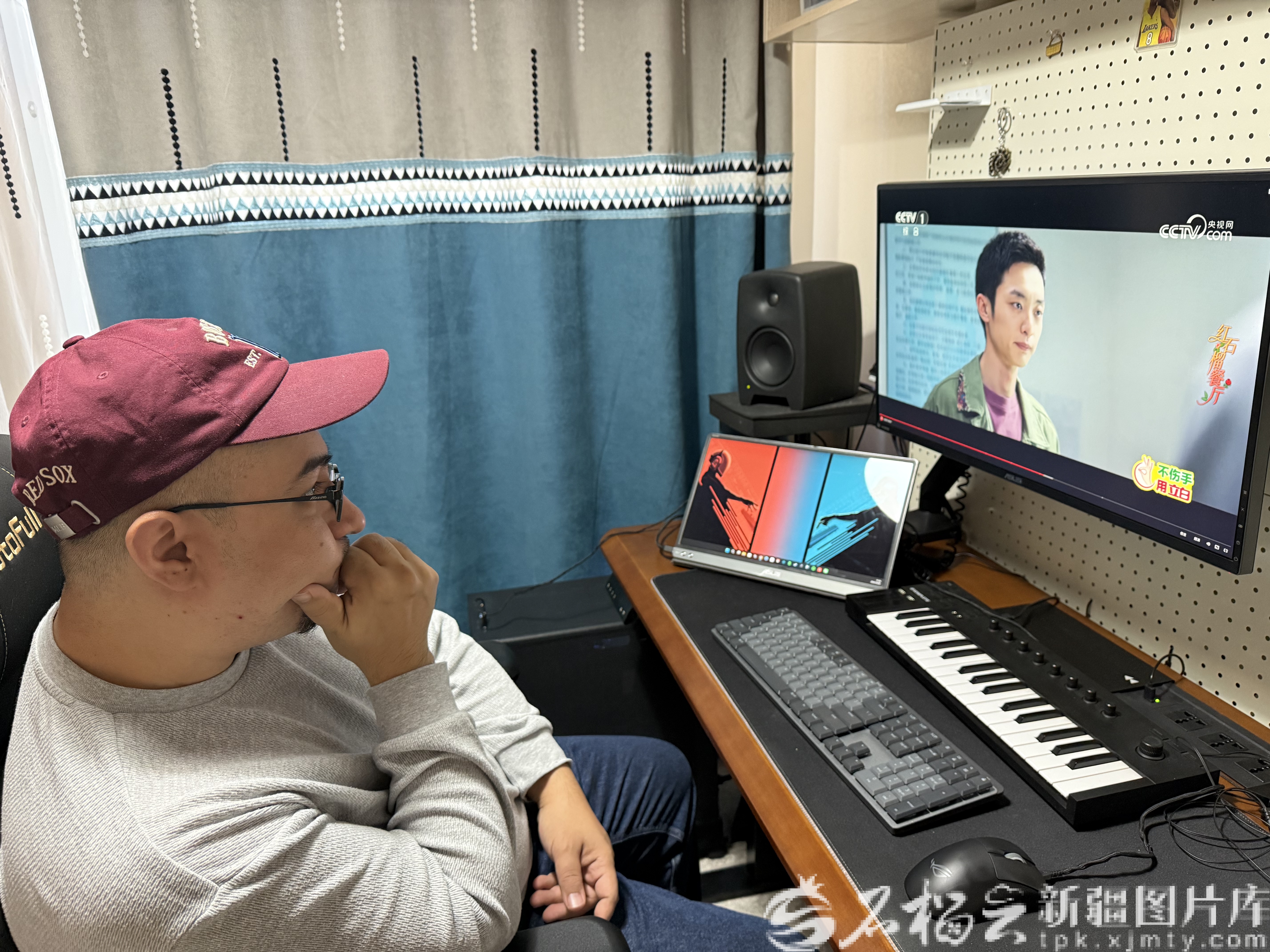 10月28日,新疆音乐制作人祖力福卡尔·亚地卡尔在录音间隙抽空追剧。祖力福卡尔·亚地卡尔提供