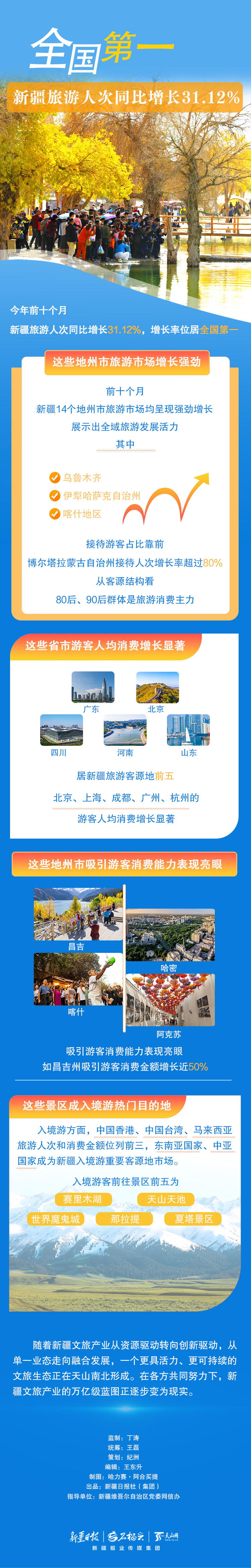 今年前十个月,新疆旅游人次同比增长31.12%,增长率位居全国第一。各地州市旅游市场表现如何?哪些省市成为新疆重要的旅游客源地?今天的《数说“新”变化》一起来看看。