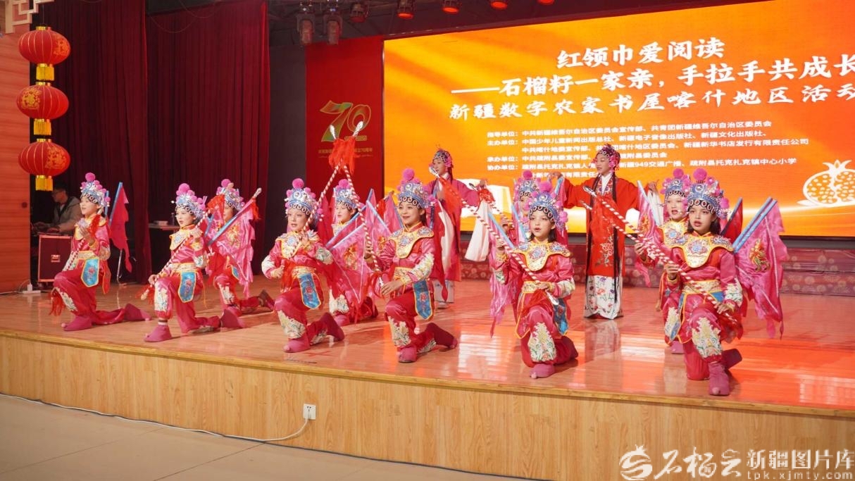 近日,在“红领巾爱阅读——石榴籽一家亲,手拉手共成长”新疆数字农家书屋喀什地区活动中,疏附县托克扎克镇中心小学的少先队员们在表演戏曲《穆桂英挂帅》。高溢蔓摄