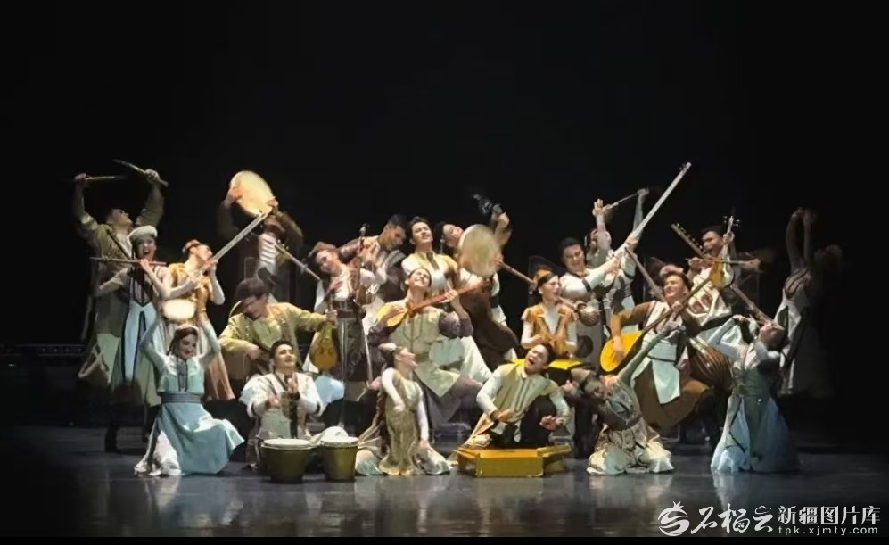 舞台上,身着传统民族服饰、手拿各种乐器的舞者,在看不见的“画框”中舞蹈,让画作“动态展示”,悠扬婉转的萨塔尔琴旋律与舞者刚柔并济的舞步交织共鸣,既生动刻画了木卡姆艺术传承者的鲜活群像,更串联起一代代人挖掘、保护、传承这一优秀传统民族文化的奋斗历程,让观众直观感受到木卡姆艺术背后绵长的人文力量。